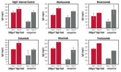 下圖是CHOgro® High Yield Expression System(紅色)與其他品牌CHO細胞瞬轉系統(灰色)在表達幾個不同單抗的產量對比。Mirus CHO細胞高滴度瞬轉表達系統的蛋白產量與競爭品牌相比具有顯著優勢。