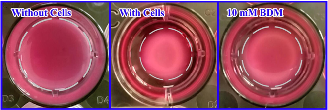 根據實驗方案(上圖),虛線表示凝膠邊緣,用尺子分別測量無細胞組、有細胞組和10mM細胞收縮抑制劑BDM處理組的膠原基質的直徑(單位:mm),對比BDM處理組與對照組細胞收縮的變化。