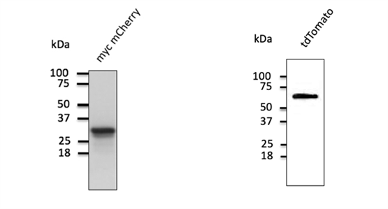 ? ? 西美杰代理SICGEN品牌提供的Anti-mCherry和Anti-tdTomato均為從圓盤珊瑚中提取的紅色熒光蛋白的多克隆抗體。Anti-mCherry和Anti-tdTomato兩種抗體的抗原均是大腸桿菌表達的重組多肽純化而來,用Western blot檢測轉染了兩種蛋白的HEK293細胞,分別可檢測到29kda和55kda的條帶。Anti-tdTomato抗體對tdTomato和mCherry均有特異性,但與綠色熒光蛋白(GFP)不發生交叉反應。???????????