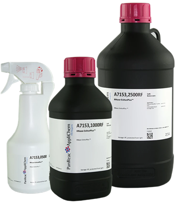 在mRNA疫苗的生產(chǎn)以及其他與mRNA相關(guān)的生物制品中,RNase污染的清除尤為重要,德國(guó)Applichem研發(fā)的RNase-ExitusPlus?是一種非堿性、無腐蝕性且無致癌性的新型RNase清除液,它對(duì)RNase污染物具有很好的清除性能,是適用于任何表面的即用型RNase污染清除液,可用于實(shí)驗(yàn)室表面的清潔,如實(shí)驗(yàn)操作臺(tái)、電泳設(shè)備、移液器和反應(yīng)管等。