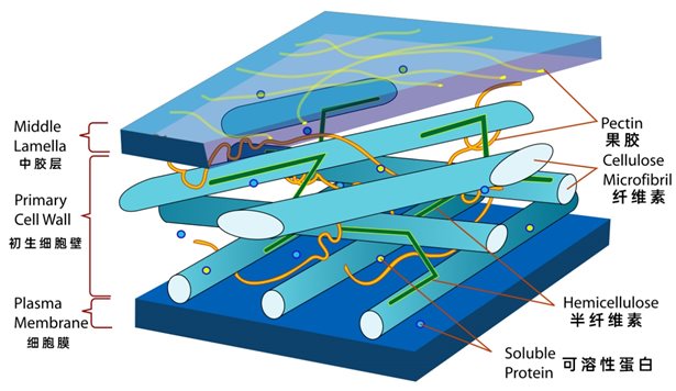 植物細胞壁由胞間層、初生壁和次生壁構成。胞間層又稱中膠層,其主要成分為果膠質,用于將相鄰細胞粘連在一起,并可緩沖細胞間的擠壓。初生壁是由原生質體分泌形成的細胞壁,位于胞間層內側,通常較薄,具有較大的可塑性,可使細胞保持一定形狀,又能隨細胞生長而延展。次生壁是植物細胞停止生長后,其初生壁內側繼續(xù)積累的細胞壁層,位于質膜和初生壁之間,通常較厚,約5~10微米,而且堅硬,使細胞壁具有很大的機械強度。有研究人員發(fā)現(xiàn)細胞壁上微纖絲的排列方向各層很不一樣,一般初生壁上的微纖絲多呈不規(guī)則交錯的網(wǎng)狀,而在次生壁上則往往比較有規(guī)則。