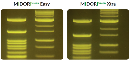 圖3:使用MIDORI Green Xtra檢測(cè)的DNA條帶具有超高靈敏度(注:左圖使用藍(lán)色/綠色 LED 透射儀進(jìn)行檢測(cè);右圖使用藍(lán)色LED透射儀進(jìn)行檢測(cè)。)