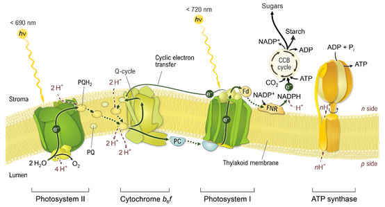 植物光合作包括光能的吸收、能量轉換、電子傳遞、ATP的合成以及CO2的固定等步驟,這一過程主要在植物的葉綠體的類囊體膜上完成的。類囊體膜上存在四種關鍵的蛋白復合體:光系統II(PS II)、Cytb6/f復合體、光系統I(PS I)和ATP合成酶,這四種復合體協同作用,共同完成光反應。光系統II上具有捕光色素復合體(LHC)構成的天線系統,可以捕獲光能,而光系統I則利捕獲后的能量進行原初光化學反應。Cytb6/f復合體在電子傳遞過程中起著至關重要的作用,ATP合成酶則負責合成ATP,為植物細胞提供能量。