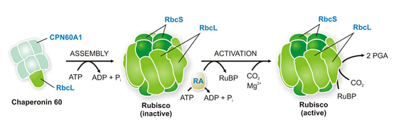 CO2的固定是利用光反應產生的ATP和NADPH合成有機物的過程,該過程稱為卡爾文循環。1,5二磷酸核酮糖羧化/加氧酶(Rubisco)是CO2固定過程中的關鍵限速酶,催化CO2和RuBP(核酮糖-1,5-二磷酸)發生羧化、然后裂解形成兩個PGA(甘油酸-3-磷酸)分子。所有光合生物都具有由8個大亞基RbcL和8個小亞基Rbcs組成的I型Rubisco,且RbcL折疊到其天然狀態依賴于葉綠體定位的分子伴侶CPN60的作用。