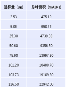 圖3. 舟帆生物ZF-LC-0001流動相線性及進樣量與總峰面積數據