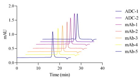 圖4. 5種單克隆抗體與2種抗體偶聯藥物在低濃度下進樣的SEC色譜圖