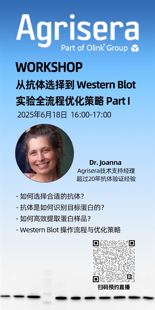 Western Blot實驗效率與結果的可靠性,很大程度上取決于對抗體特性的理解、正確的選擇以及實驗流程的優化。為解決WB實驗過程中的常見問題,Agrisera技術專家Joanna博士將為大家帶來WB全流程優化系列講座,本系列講座包含兩次線上直播課程,6月18日下午4點直播第一次課程:從抗體選擇到WB全流程優化策略,深度解析Western Blot技術的關鍵環節,為您提供專業的優化方案,歡迎大家提前報名預約。