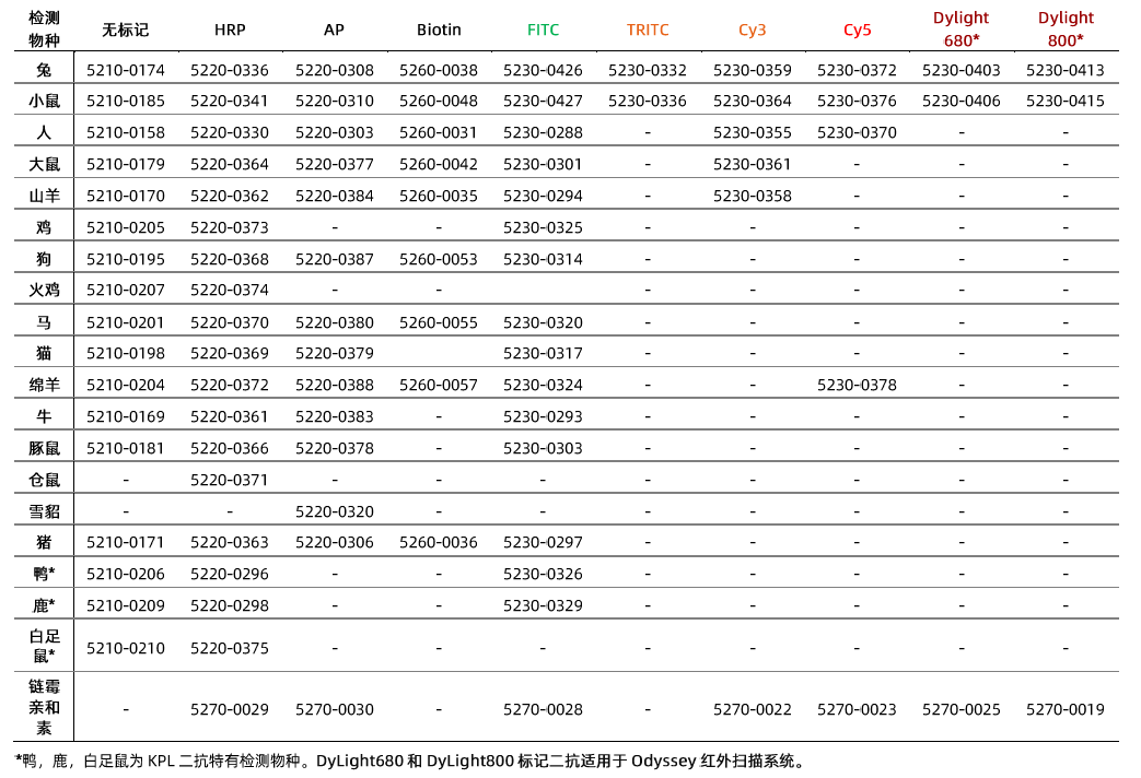 - 種屬齊全:KPL 的二抗覆蓋20 多個(gè)物種,主要種屬有:人、兔、小鼠、大鼠、山羊、綿羊、馬、牛、猴、豬、貓、雞、豚鼠、倉(cāng)鼠等,其中特殊物種二抗有鴨、鹿和白足鼠。