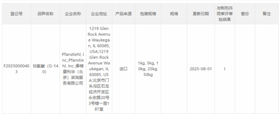 “熱烈祝賀Pfanstiehl的注射級甘氨酸Glycine(G-140)喜獲CDE登記號F20250000403, 這是Pfanstiehl產品獲得的第18個CDE登記號!”
